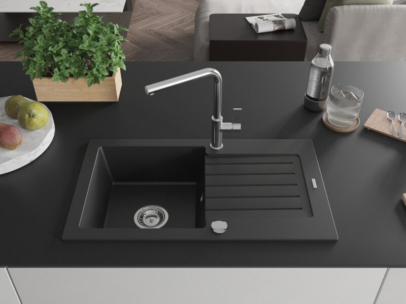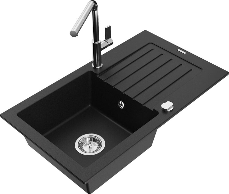 Technické dáta: drez: Rozmer: 752 x 436 x 161 mm Hĺbka komory: 151 mm Rozmery komory: 356×332 mm Priemer odtoku: ø90 mm Typ: 1-miska s odkvapkávačom Typ: Zapustené do pracovnej dosky Čierna farba Povrchová úprava sifónu: Chrome Materiál: žula (80% žulové kamenivo, 20% živice) Prepadový otvor: Áno Otvory: (batérie, automatické) 2 Inštalácia: Univerzálna, je možné inštalovať s odkvapkávačom na ľavú alebo pravú stranu Vysoká odolnosť proti poškriabaniu a zmene farby Odolnosť proti tepelným šokom Ľahko čistiteľný povrch Dva dodatočné vyfrézované otvory na samodierovanie ø35 kuchynská batéria: Materiál: mosadz Farba: Chrome Hlava: Keramická Prevzdušňovač: Áno Typ: Jedna páka Rozsah výtoku: 245 mm Výška batérie: 307 mm(GT) Ean: 5905315059895