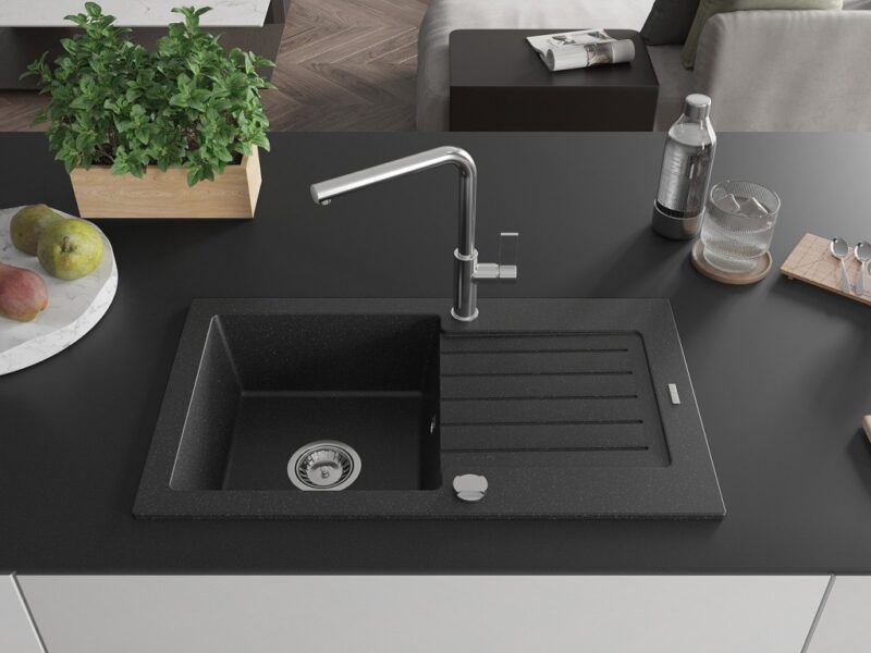 Technické dáta: drez: Rozmer: 752 x 436 x 161 mm Hĺbka komory: 151 mm Rozmery komory: 356×332 mm Priemer odtoku: ø90 mm Typ: 1-miska s odkvapkávačom Typ: Zapustené do pracovnej dosky Farba: čierna/strieborná metalíza Povrchová úprava sifónu: Chrome Materiál: žula (80% žulové kamenivo, 20% živice) Prepadový otvor: Áno Otvory: (batérie, automatické) 2 Inštalácia: Univerzálna, je možné inštalovať s odkvapkávačom na ľavú alebo pravú stranu Vysoká odolnosť proti poškriabaniu a zmene farby Odolnosť proti tepelným šokom Ľahko čistiteľný povrch Dva dodatočné vyfrézované otvory na samodierovanie ø35 kuchynská batéria: Materiál: mosadz Farba: Chrome Hlava: Keramická Prevzdušňovač: Áno Typ: Jedna páka Rozsah výtoku: 245 mm Výška batérie: 307 mm(GT) Ean: 5905315059673