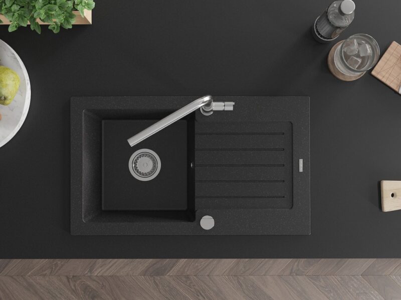 MEXEN/S MEXEN/S – Pablo granitový drez 1 s odkvapkávačom vrátane batérie Flora, čierna/strieborná metalík 6510-73-670401-00