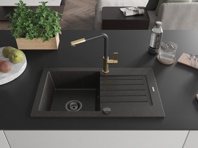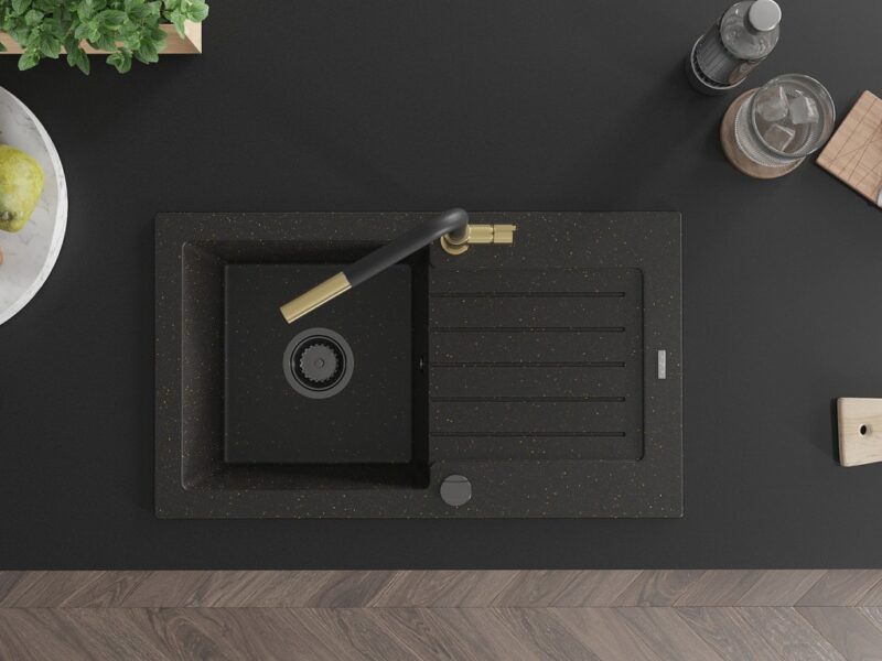 MEXEN/S MEXEN/S – Pablo granitový drez 1 s odkvapkávačom vrátane batérie Flora, čierna/zlatá metalik 6510-75-670401-57-B