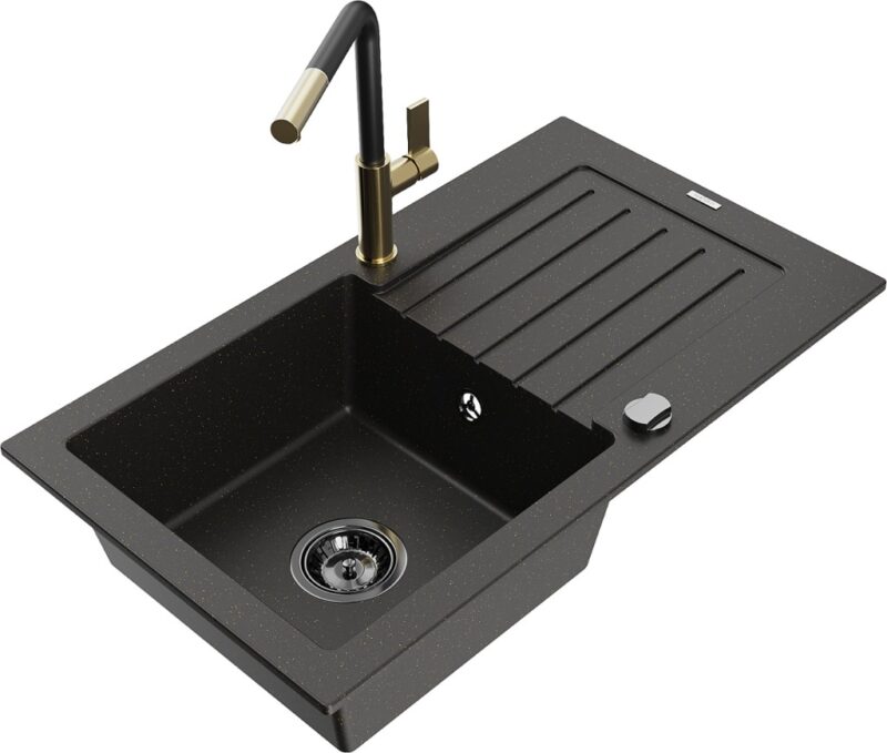 Technické dáta: drez: Rozmer: 752 x 436 x 161 mm Hĺbka komory: 151 mm Rozmery komory: 356×332 mm Priemer odtoku: ø90 mm Typ: 1-miska s odkvapkávačom Typ: Zapustené do pracovnej dosky Farba: čierna / zlatá metalíza Povrchová úprava sifónu: čierna Materiál: žula (80% žulové kamenivo, 20% živice) Prepadový otvor: Áno Otvory: (batérie, automatické) 2 Inštalácia: Univerzálna, je možné inštalovať s odkvapkávačom na ľavú alebo pravú stranu Vysoká odolnosť proti poškriabaniu a zmene farby Odolnosť proti tepelným šokom Ľahko čistiteľný povrch Dva dodatočné vyfrézované otvory na samodierovanie ø35 kuchynská batéria: Materiál: mosadz Farba: Zlatá/Čierna Hlava: Keramická Prevzdušňovač: Áno Typ: Jedna páka Rozsah výtoku: 245 mm Výška batérie: 307 mm(GT) Ean: 5905315059772