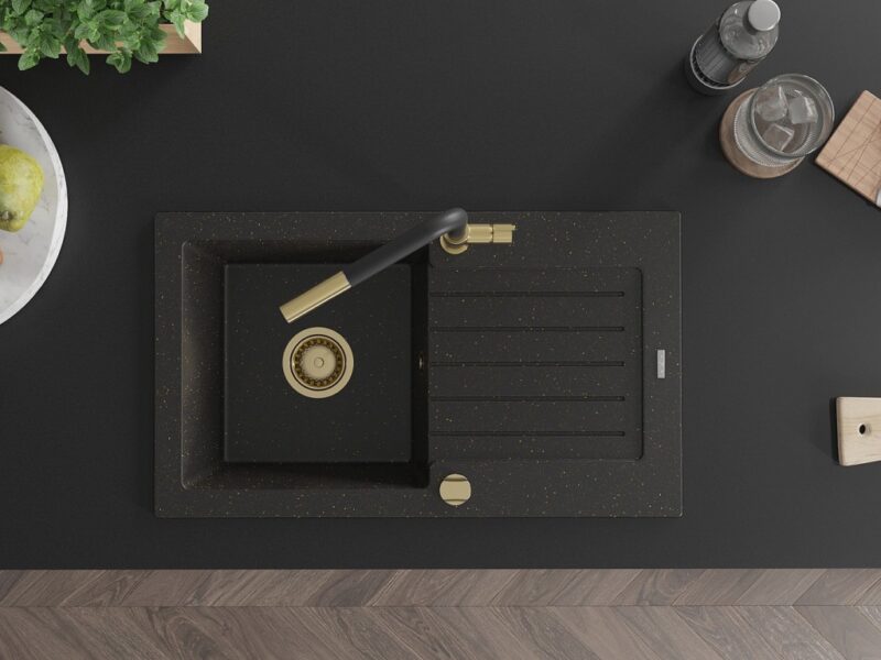 MEXEN/S MEXEN/S – Pablo granitový drez 1 s odkvapkávačom vrátane batérie Flora, čierna/zlatá metalik 6510-75-670401-57-G