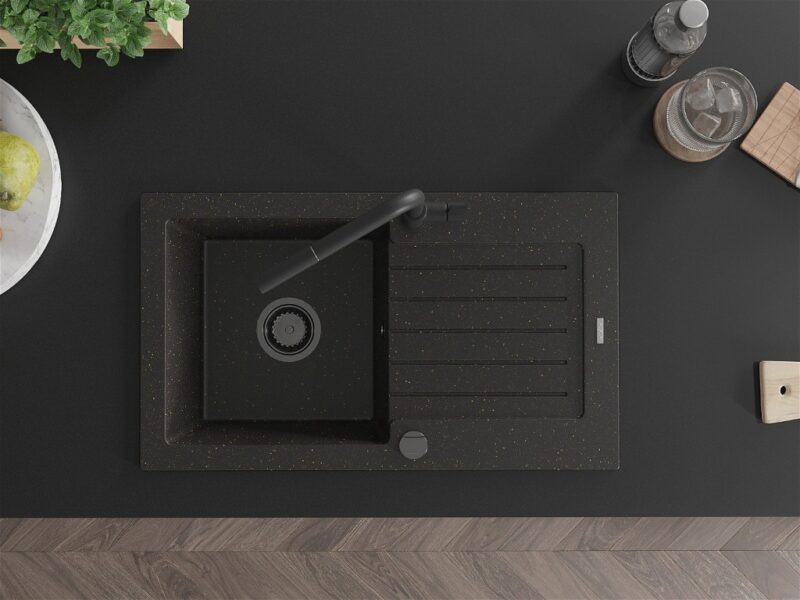 MEXEN/S MEXEN/S – Pablo granitový drez 1 s odkvapkávačom vrátane batérie Flora, čierna/zlatá metalik 6510-75-670401-70-B