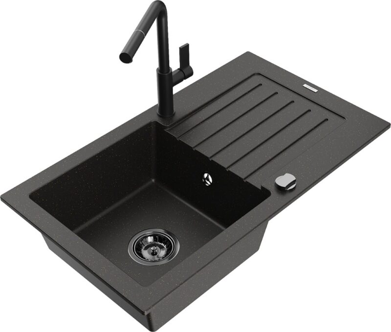 Technické dáta: drez: Rozmer: 752 x 436 x 161 mm Hĺbka komory: 151 mm Rozmery komory: 356×332 mm Priemer odtoku: ø90 mm Typ: 1-miska s odkvapkávačom Typ: Zapustené do pracovnej dosky Farba: čierna / zlatá metalíza Povrchová úprava sifónu: čierna Materiál: žula (80% žulové kamenivo, 20% živice) Prepadový otvor: Áno Otvory: (batérie, automatické) 2 Inštalácia: Univerzálna, je možné inštalovať s odkvapkávačom na ľavú alebo pravú stranu Vysoká odolnosť proti poškriabaniu a zmene farby Odolnosť proti tepelným šokom Ľahko čistiteľný povrch Dva dodatočné vyfrézované otvory na samodierovanie ø35 kuchynská batéria: Materiál: mosadz Čierna farba Hlava: Keramická Prevzdušňovač: Áno Typ: Jedna páka Rozsah výtoku: 245 mm Výška batérie: 307 mm(GT) Ean: 5905315059789