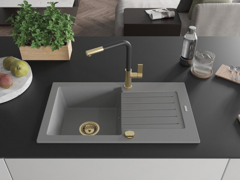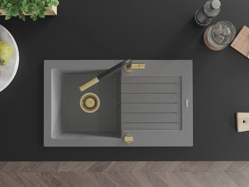 Technické dáta: drez: Rozmer: 752 x 436 x 161 mm Hĺbka komory: 151 mm Rozmery komory: 356×332 mm Priemer odtoku: ø90 mm Typ: 1-miska s odkvapkávačom Typ: Zapustené do pracovnej dosky Šedá farba Povrchová úprava sifónu: zlatá Materiál: žula (80% žulové kamenivo, 20% živice) Prepadový otvor: Áno Otvory: (batérie, automatické) 2 Inštalácia: Univerzálna, je možné inštalovať s odkvapkávačom na ľavú alebo pravú stranu Vysoká odolnosť proti poškriabaniu a zmene farby Odolnosť proti tepelným šokom Ľahko čistiteľný povrch Dva dodatočné vyfrézované otvory na samodierovanie ø35 kuchynská batéria: Materiál: mosadz Farba: Zlatá/Čierna Hlava: Keramická Prevzdušňovač: Áno Typ: Jedna páka Rozsah výtoku: 245 mm Výška batérie: 307 mm(GT) Ean: 5905315059642