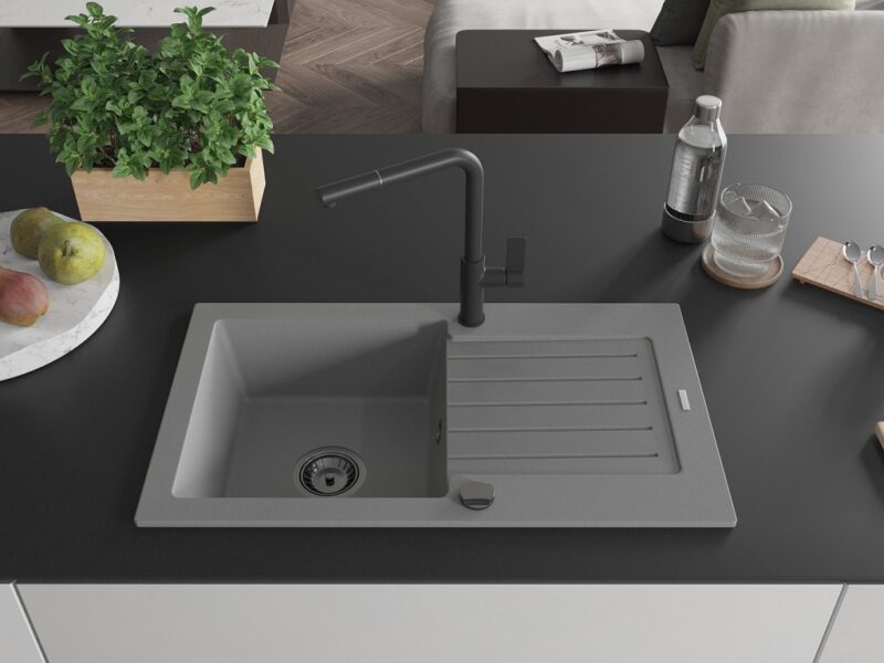 Technické dáta: drez: Rozmer: 752 x 436 x 161 mm Hĺbka komory: 151 mm Rozmery komory: 356×332 mm Priemer odtoku: ø90 mm Typ: 1-miska s odkvapkávačom Typ: Zapustené do pracovnej dosky Šedá farba Povrchová úprava sifónu: čierna Materiál: žula (80% žulové kamenivo, 20% živice) Prepadový otvor: Áno Otvory: (batérie, automatické) 2 Inštalácia: Univerzálna, je možné inštalovať s odkvapkávačom na ľavú alebo pravú stranu Vysoká odolnosť proti poškriabaniu a zmene farby Odolnosť proti tepelným šokom Ľahko čistiteľný povrch Dva dodatočné vyfrézované otvory na samodierovanie ø35 kuchynská batéria: Materiál: mosadz Čierna farba Hlava: Keramická Prevzdušňovač: Áno Typ: Jedna páka Rozsah výtoku: 245 mm Výška batérie: 307 mm(GT) Ean: 5905315059666