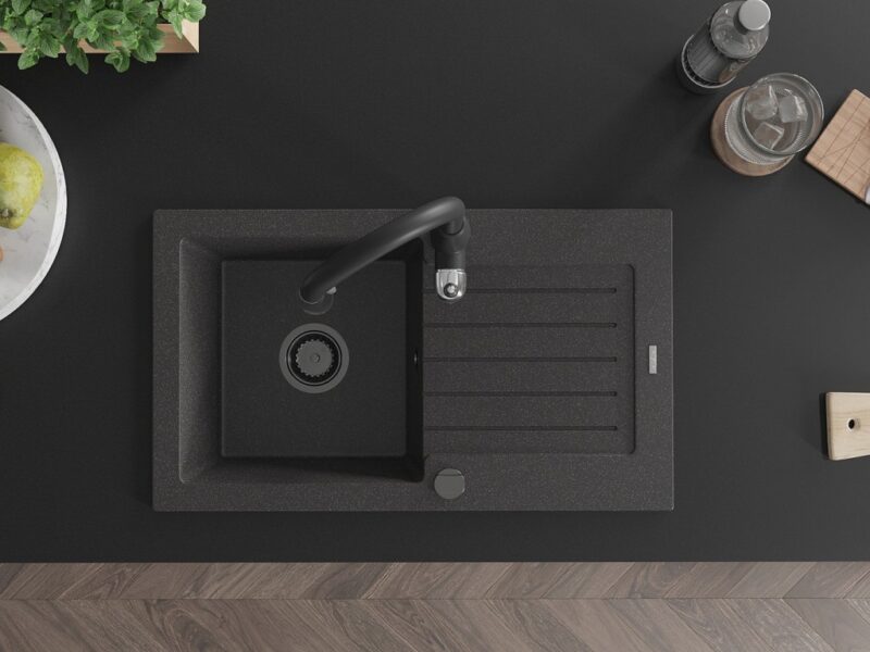 Technické dáta: drez: Rozmer: 752 x 436 x 161 mm Hĺbka komory: 151 mm Rozmery komory: 356×332 mm Priemer odtoku: ø90 mm Typ: 1-miska s odkvapkávačom Typ: Zapustené do pracovnej dosky Farba: Škvrnitá čierna Povrchová úprava sifónu: čierna Materiál: žula (80% žulové kamenivo, 20% živice) Prepadový otvor: Áno Otvory: (batérie, automatické) 2 Inštalácia: Univerzálna, je možné inštalovať s odkvapkávačom na ľavú alebo pravú stranu Vysoká odolnosť proti poškriabaniu a zmene farby Odolnosť proti tepelným šokom Ľahko čistiteľný povrch Dva dodatočné vyfrézované otvory na samodierovanie ø35 kuchynská batéria: Materiál: mosadz Čierna farba Hlava: Keramická Prevzdušňovač: Áno Typ: Jedna páka Výška batérie: 410 mm Rozsah výtoku: 231 mm(GT) Ean: 5905315034731