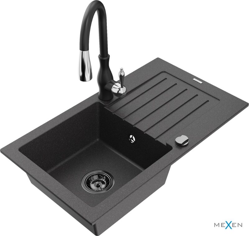 MEXEN/S MEXEN/S – Pablo granitový drez 1 s odkvapkávačom vrátane batérie Savita, čierna kropenatá 6510-76-672601-70-B