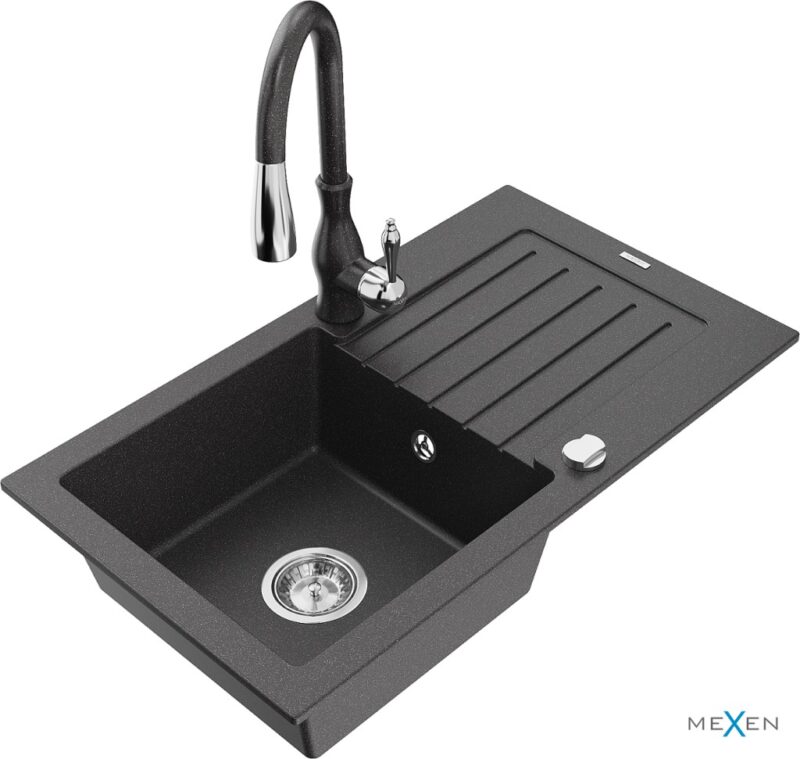MEXEN/S MEXEN/S – Pablo granitový drez 1 s odkvapkávačom vrátane batérie Savita, čierna kropenatá 6510-76-672601-76