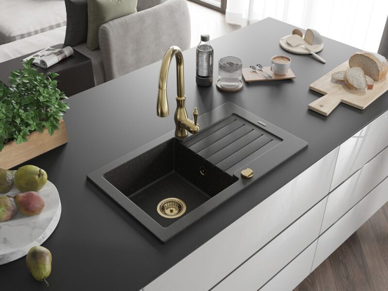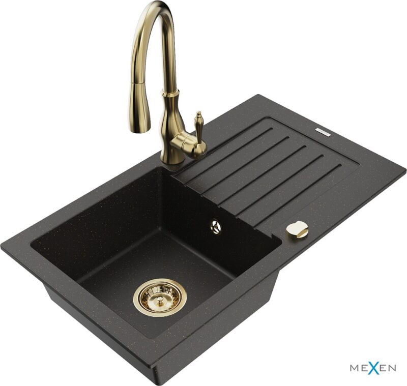 MEXEN/S MEXEN/S – Pablo granitový drez 1 s odkvapkávačom vrátane batérie Savita, čierna/zlatá metalik 6510-75-672601-50