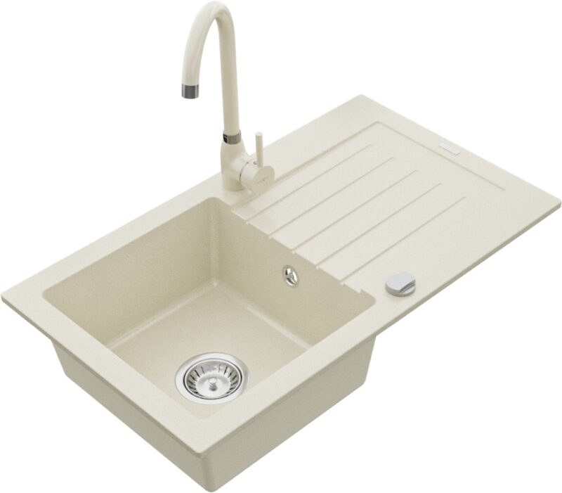 Špecifikácia produktu: drez: Rozmer: 752 x 436 x 161 mm Hĺbka komory: 151 mm Rozmery komory: 356×332 mm Priemer odtoku: ø90 mm Typ: 1-miska s odkvapkávačom Typ: Zapustené do pracovnej dosky Farba béžová Materiál: žula (80% žulové kamenivo, 20% živice) Prepadový otvor: Áno Otvory: (batérie, automatické) 2 Inštalácia: Univerzálna, je možné inštalovať s odkvapkávačom na ľavú alebo pravú stranu Vysoká odolnosť proti poškriabaniu a zmene farby Odolnosť proti tepelným šokom Ľahko čistiteľný povrch Dva dodatočné vyfrézované otvory na samodierovanie ø35 kuchynská batéria: Materiál: mosadz Farba béžová Hlava: Keramická Prevzdušňovač: Áno Výška batérie: 335 mm Rozsah výtoku: 180 mm(GT) Ean: 5907709160187