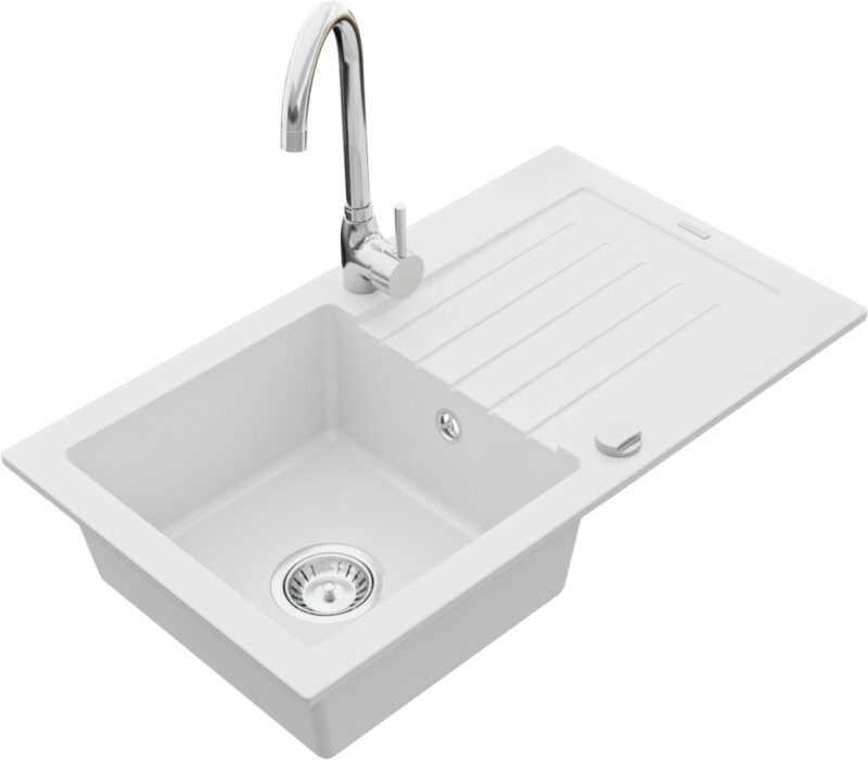 Technické dáta: drez: Rozmer: 752 x 436 x 161 mm Hĺbka komory: 151 mm Rozmery komory: 356×332 mm Priemer odtoku: ø90 mm Typ: 1-miska s odkvapkávačom Typ: Zapustené do pracovnej dosky biela farba Povrchová úprava sifónu: Chrome Materiál: žula (80% žulové kamenivo, 20% živice) Prepadový otvor: Áno Otvory: (batérie, automatické) 2 Inštalácia: Univerzálna, je možné inštalovať s odkvapkávačom na ľavú alebo pravú stranu Vysoká odolnosť proti poškriabaniu a zmene farby Odolnosť proti tepelným šokom Ľahko čistiteľný povrch Dva dodatočné vyfrézované otvory na samodierovanie ø35 kuchynská batéria: Materiál: mosadz Farba: Chrome Hlava: Keramická Prevzdušňovač: Áno Výška batérie: 335 mm Rozsah výtoku: 180 mm(GT) Ean: 5907709160156