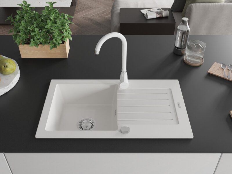Technické dáta: drez: Rozmer: 752 x 436 x 161 mm Hĺbka komory: 151 mm Rozmery komory: 356×332 mm Priemer odtoku: ø90 mm Typ: 1-miska s odkvapkávačom Typ: Zapustené do pracovnej dosky biela farba Povrchová úprava sifónu: Chrome Materiál: žula (80% žulové kamenivo, 20% živice) Prepadový otvor: Áno Otvory: (batérie, automatické) 2 Inštalácia: Univerzálna, je možné inštalovať s odkvapkávačom na ľavú alebo pravú stranu Vysoká odolnosť proti poškriabaniu a zmene farby Odolnosť proti tepelným šokom Ľahko čistiteľný povrch Dva dodatočné vyfrézované otvory na samodierovanie ø35 kuchynská batéria: Materiál: mosadz biela farba Hlava: Keramická Prevzdušňovač: Áno Výška batérie: 335 mm Rozsah výtoku: 180 mm(GT) Ean: 5907709160163