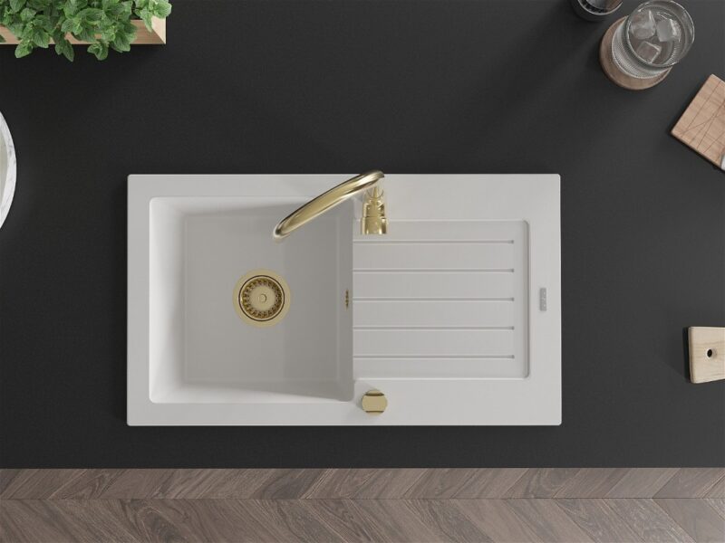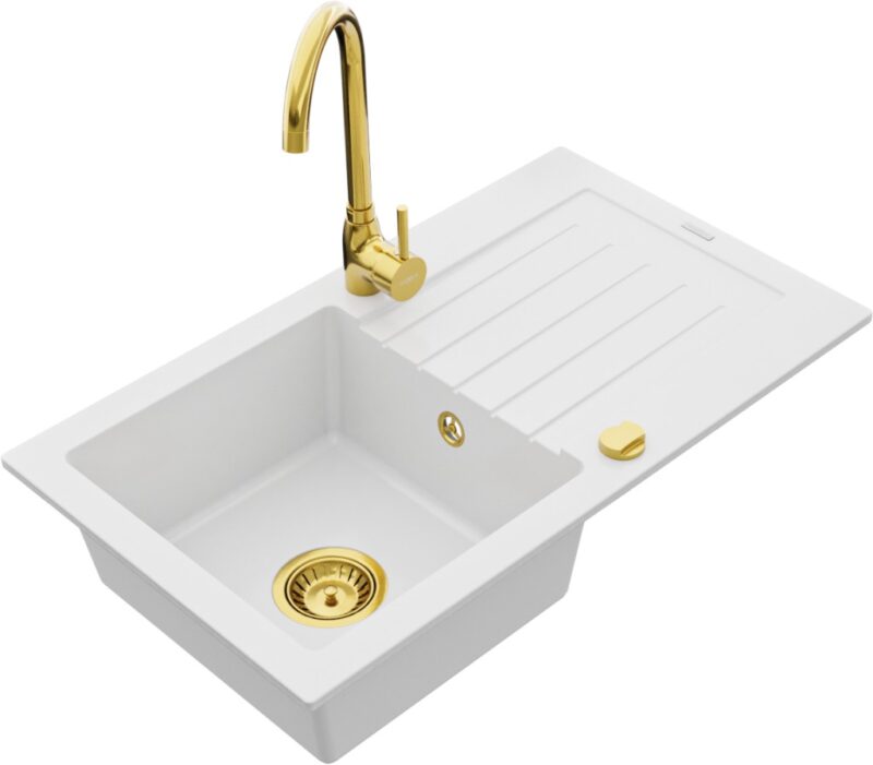 Technické dáta: drez: Rozmer: 752 x 436 x 161 mm Hĺbka komory: 151 mm Rozmery komory: 356×332 mm Priemer odtoku: ø90 mm Typ: 1-miska s odkvapkávačom Typ: Zapustené do pracovnej dosky biela farba Povrchová úprava sifónu: zlatá Materiál: žula (80% žulové kamenivo, 20% živice) Prepadový otvor: Áno Otvory: (batérie, automatické) 2 Inštalácia: Univerzálna, je možné inštalovať s odkvapkávačom na ľavú alebo pravú stranu Vysoká odolnosť proti poškriabaniu a zmene farby Odolnosť proti tepelným šokom Ľahko čistiteľný povrch Dva dodatočné vyfrézované otvory na samodierovanie ø35 kuchynská batéria: Materiál: mosadz Farba: Zlatá Hlava: Keramická Prevzdušňovač: Áno Výška batérie: 335 mm Rozsah výtoku: 180 mm(GT) Ean: 5907709160170