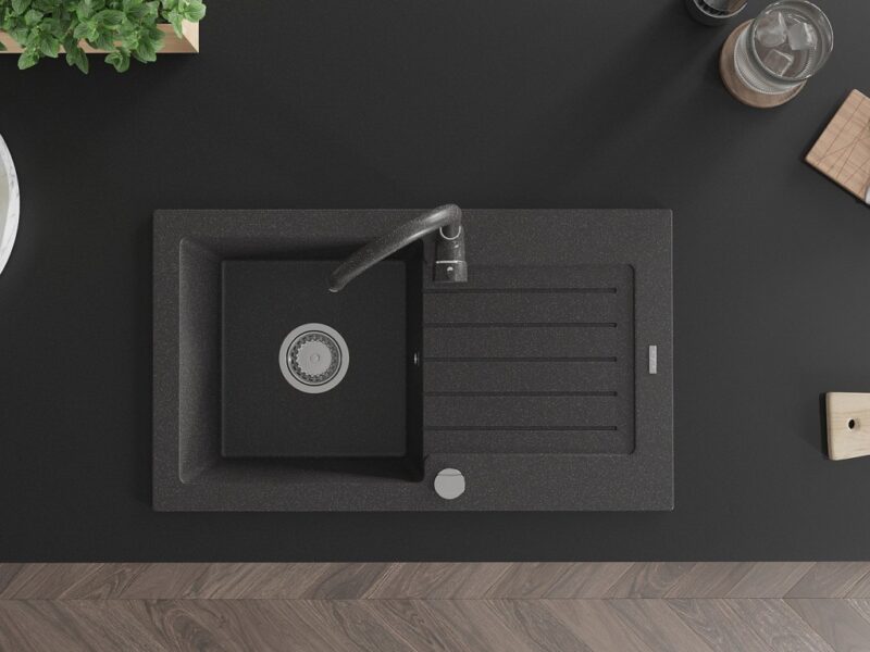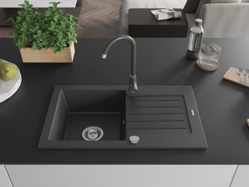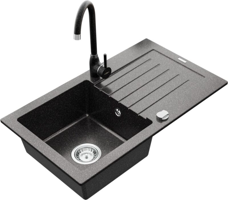 Technické dáta: drez: Rozmer: 752 x 436 x 161 mm Hĺbka komory: 151 mm Rozmery komory: 356×332 mm Priemer odtoku: ø90 mm Typ: 1-miska s odkvapkávačom Typ: Zapustené do pracovnej dosky Farba: Škvrnitá čierna Povrchová úprava sifónu: Chrome Materiál: žula (80% žulové kamenivo, 20% živice) Prepadový otvor: Áno Otvory: (batérie, automatické) 2 Inštalácia: Univerzálna, je možné inštalovať s odkvapkávačom na ľavú alebo pravú stranu Vysoká odolnosť proti poškriabaniu a zmene farby Odolnosť proti tepelným šokom Ľahko čistiteľný povrch Dva dodatočné vyfrézované otvory na samodierovanie ø35 kuchynská batéria: Materiál: mosadz Farba: Škvrnitá čierna Hlava: Keramická Prevzdušňovač: Áno Výška batérie: 335 mm Rozsah výtoku: 180 mm(GT) Ean: 5907709160262