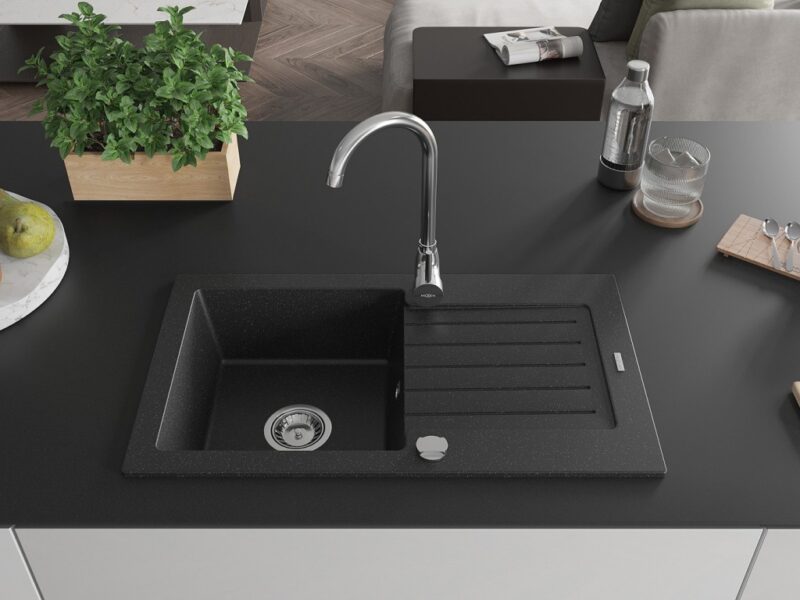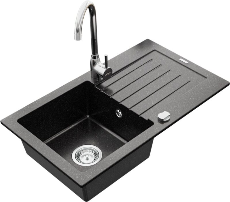 MEXEN/S MEXEN/S – Pablo granitový drez 1 s odkvapkávačom vrátane batérie Telma, čierna/strieborný 6510-73-670200-00
