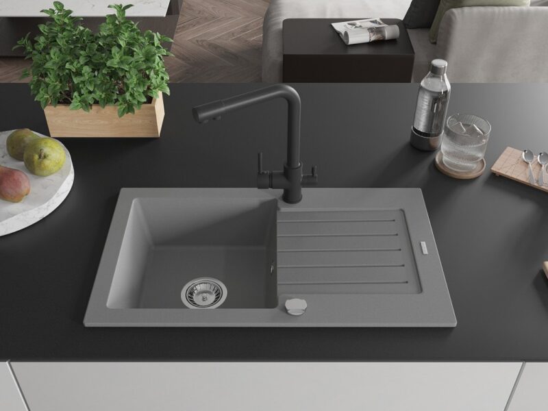 Technické dáta: drez: Rozmer: 752 x 436 x 161 mm Hĺbka komory: 151 mm Rozmery komory: 356×332 mm Priemer odtoku: ø90 mm Typ: 1-miska s odkvapkávačom Typ: Zapustené do pracovnej dosky Šedá farba Povrchová úprava sifónu: Chrome Materiál: žula (80% žulové kamenivo, 20% živice) Prepadový otvor: Áno Otvory: (batérie, automatické) 2 Inštalácia: Univerzálna, je možné inštalovať s odkvapkávačom na ľavú alebo pravú stranu Vysoká odolnosť proti poškriabaniu a zmene farby Odolnosť proti tepelným šokom Ľahko čistiteľný povrch Dva dodatočné vyfrézované otvory na samodierovanie ø35 kuchynská batéria: Materiál: mosadz Čierna farba Hlava: Keramická Prevzdušňovač: Áno Typ: Dve rukoväte Rozsah výtoku: 235 mm Výška batérie: 315 mm Dvojhlavá batéria s prídavným kanálom pre filtrovanú pitnú vodu(GT) Ean: 5905315024350