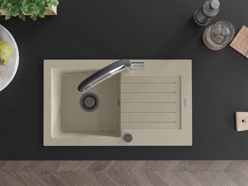 Technické dáta: drez: Rozmer: 752 x 436 x 161 mm Hĺbka komory: 151 mm Rozmery komory: 356×332 mm Priemer odtoku: ø90 mm Typ: 1-miska s odkvapkávačom Typ: Zapustené do pracovnej dosky Farba béžová Povrchová úprava sifónu: čierna Materiál: žula (80% žulové kamenivo, 20% živice) Prepadový otvor: Áno Otvory: (batérie, automatické) 2 Inštalácia: Univerzálna, je možné inštalovať s odkvapkávačom na ľavú alebo pravú stranu Vysoká odolnosť proti poškriabaniu a zmene farby Odolnosť proti tepelným šokom Ľahko čistiteľný povrch Dva dodatočné vyfrézované otvory na samodierovanie ø35 kuchynská batéria: Materiál: mosadz Farba: chróm/čierna Hlavy: Keramické Prevzdušňovač: Áno Typ hubica: Flexibilný s mosadzným držiakom Rozsah výtoku: 260 mm Výška: 405 mm Typ: Dve rukoväte Dvojhlavá batéria s prídavným filtrom na pitnú vodu(GT) Ean: 5905315100870