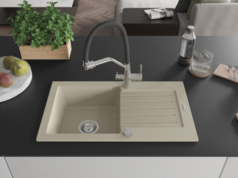 Technické dáta: drez: Rozmer: 752 x 436 x 161 mm Hĺbka komory: 151 mm Rozmery komory: 356×332 mm Priemer odtoku: ø90 mm Typ: 1-miska s odkvapkávačom Typ: Zapustené do pracovnej dosky Farba béžová Povrchová úprava sifónu: Chrome Materiál: žula (80% žulové kamenivo, 20% živice) Prepadový otvor: Áno Otvory: (batérie, automatické) 2 Inštalácia: Univerzálna, je možné inštalovať s odkvapkávačom na ľavú alebo pravú stranu Vysoká odolnosť proti poškriabaniu a zmene farby Odolnosť proti tepelným šokom Ľahko čistiteľný povrch Dva dodatočné vyfrézované otvory na samodierovanie ø35 kuchynská batéria: Materiál: mosadz Farba: chróm/čierna Hlavy: Keramické Prevzdušňovač: Áno Typ hubica: Flexibilný s mosadzným držiakom Rozsah výtoku: 260 mm Výška: 405 mm Typ: Dve rukoväte Dvojhlavá batéria s prídavným filtrom na pitnú vodu(GT) Ean: 5905315100863