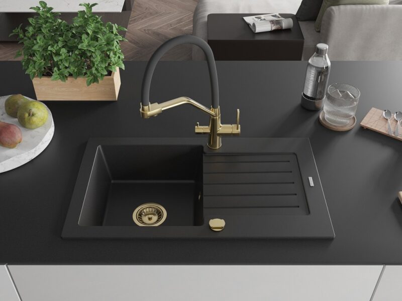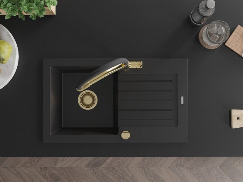 Technické dáta: drez: Rozmer: 752 x 436 x 161 mm Hĺbka komory: 151 mm Rozmery komory: 356×332 mm Priemer odtoku: ø90 mm Typ: 1-miska s odkvapkávačom Typ: Zapustené do pracovnej dosky Čierna farba Povrchová úprava sifónu: zlatá Materiál: žula (80% žulové kamenivo, 20% živice) Prepadový otvor: Áno Otvory: (batérie, automatické) 2 Inštalácia: Univerzálna, je možné inštalovať s odkvapkávačom na ľavú alebo pravú stranu Vysoká odolnosť proti poškriabaniu a zmene farby Odolnosť proti tepelným šokom Ľahko čistiteľný povrch Dva dodatočné vyfrézované otvory na samodierovanie ø35 kuchynská batéria: Materiál: mosadz Farba: Zlatá/Čierna Hlavy: Keramické Prevzdušňovač: Áno Typ hubica: Flexibilný s mosadzným držiakom Rozsah výtoku: 260 mm Výška: 405 mm Typ: Dve rukoväte Dvojhlavá batéria s prídavným filtrom na pitnú vodu(GT) Ean: 5905315101136