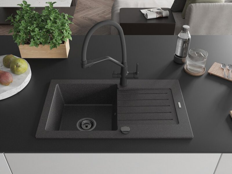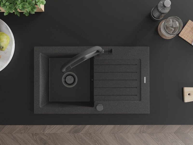 Technické dáta: drez: Rozmer: 752 x 436 x 161 mm Hĺbka komory: 151 mm Rozmery komory: 356×332 mm Priemer odtoku: ø90 mm Typ: 1-miska s odkvapkávačom Typ: Zapustené do pracovnej dosky Farba: Škvrnitá čierna Povrchová úprava sifónu: čierna Materiál: žula (80% žulové kamenivo, 20% živice) Prepadový otvor: Áno Otvory: (batérie, automatické) 2 Inštalácia: Univerzálna, je možné inštalovať s odkvapkávačom na ľavú alebo pravú stranu Vysoká odolnosť proti poškriabaniu a zmene farby Odolnosť proti tepelným šokom Ľahko čistiteľný povrch Dva dodatočné vyfrézované otvory na samodierovanie ø35 kuchynská batéria: Materiál: mosadz Čierna farba Hlavy: Keramické Prevzdušňovač: Áno Typ hubica: Flexibilný s mosadzným držiakom Rozsah výtoku: 260 mm Výška: 405 mm Typ: Dve rukoväte Dvojhlavá batéria s prídavným filtrom na pitnú vodu(GT) Ean: 5905315101105