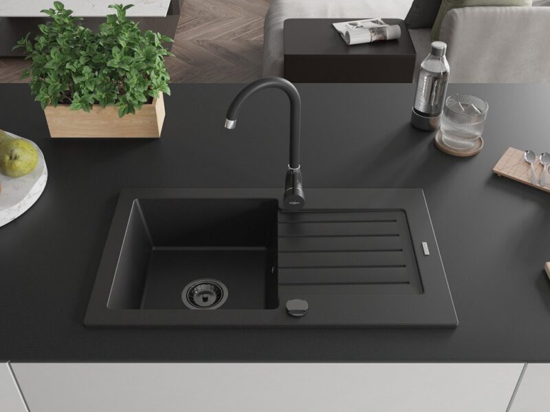 Technické dáta: drez: Rozmer: 752 x 436 x 161 mm Hĺbka komory: 151 mm Rozmery komory: 356×332 mm Priemer odtoku: ø90 mm Typ: 1-miska s odkvapkávačom Typ: Zapustené do pracovnej dosky Čierna farba Povrchová úprava sifónu: čierna Materiál: žula (80% žulové kamenivo, 20% živice) Prepadový otvor: Áno Otvory: (batérie, automatické) 2 Inštalácia: Univerzálna, je možné inštalovať s odkvapkávačom na ľavú alebo pravú stranu Vysoká odolnosť proti poškriabaniu a zmene farby Odolnosť proti tepelným šokom Ľahko čistiteľný povrch Dva dodatočné vyfrézované otvory na samodierovanie ø35 kuchynská batéria: Materiál: mosadz Čierna farba Hlava: Keramická Prevzdušňovač: Áno Typ: Jedna páka Výška batérie: 335 mm Rozsah výtoku: 180 mm(GT) Ean: 5905315015075