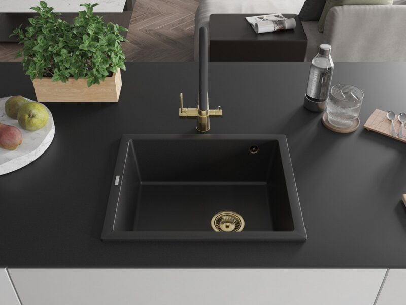 MEXEN/S MEXEN/S – Pedro granitový drez 1-miska 560 x 460 mm, čierna, sifón zlatá 6508561000-77-G