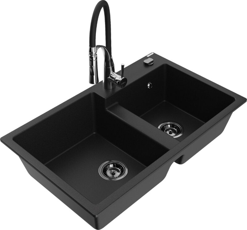MEXEN/S MEXEN/S – Tomas granitový drez 2-bowl vrátane batérie Aster, čierna 6516-77-73450-07-B