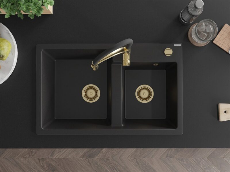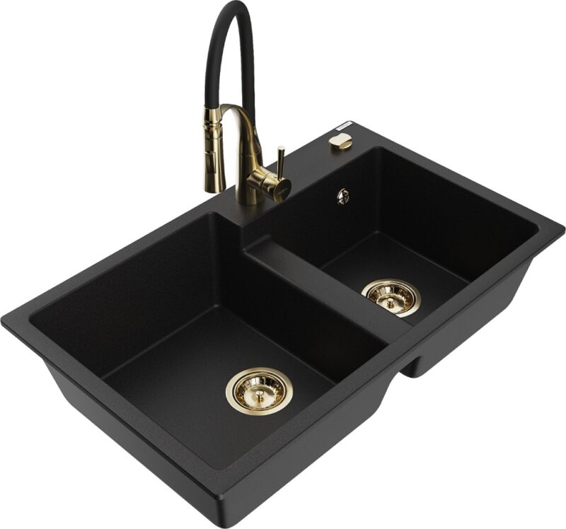 Technické dáta: drez: Rozmer: 800 x 500 x 190 mm Hĺbka komory: 180 mm (väčšia), 180 mm (menšia) Rozmery komory: 440×387 mm (väčšie), 370×303 mm (menšie) Priemer odtoku: ø90 mm Typ: 2-komorový Typ: Zapustené do pracovnej dosky Materiál: žula Čierna farba Povrchová úprava sifónu: zlatá Materiál: žula (80% žulové kamenivo, 20% živice) Prepadový otvor: Áno Otvory: (batérie, automatické) 2 Vysoká odolnosť proti poškriabaniu a zmene farby Odolnosť proti tepelným šokom Ľahko čistiteľný povrch Jeden dodatočný vyfrézovaný otvor na samodierovanie ø35 kuchynská batéria: Materiál: mosadz Farba: Zlatá/Čierna Hlava: Keramická Prevzdušňovač: Áno Typ hubica: Flexibilný s mosadzným držiakom Typ: Jedna páka Výška batérie: 430 mm Rozsah výtoku: 235 mm(GT) Ean: 5905315048363