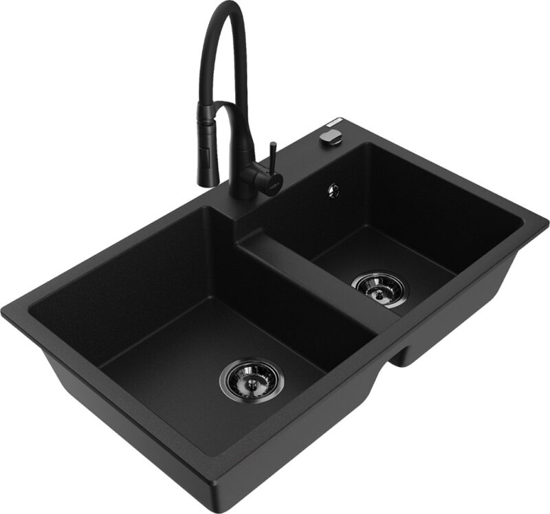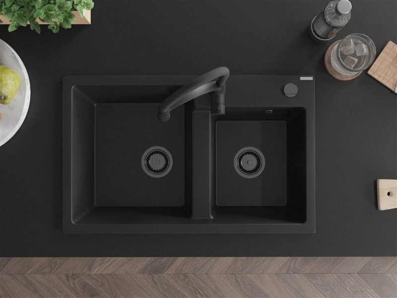 Technické dáta: drez: Rozmer: 800 x 500 x 190 mm Hĺbka komory: 180 mm (väčšia), 180 mm (menšia) Rozmery komory: 440×387 mm (väčšie), 370×303 mm (menšie) Priemer odtoku: ø90 mm Typ: 2-komorový Typ: Zapustené do pracovnej dosky Materiál: žula Čierna farba Povrchová úprava sifónu: čierna Materiál: žula (80% žulové kamenivo, 20% živice) Prepadový otvor: Áno Otvory: (batérie, automatické) 2 Vysoká odolnosť proti poškriabaniu a zmene farby Odolnosť proti tepelným šokom Ľahko čistiteľný povrch Jeden dodatočný vyfrézovaný otvor na samodierovanie ø35 kuchynská batéria: Materiál: mosadz Čierna farba Hlava: Keramická Prevzdušňovač: Áno Typ hubica: Flexibilný s mosadzným držiakom Typ: Jedna páka Výška batérie: 430 mm Rozsah výtoku: 235 mm(GT) Ean: 5905315048387