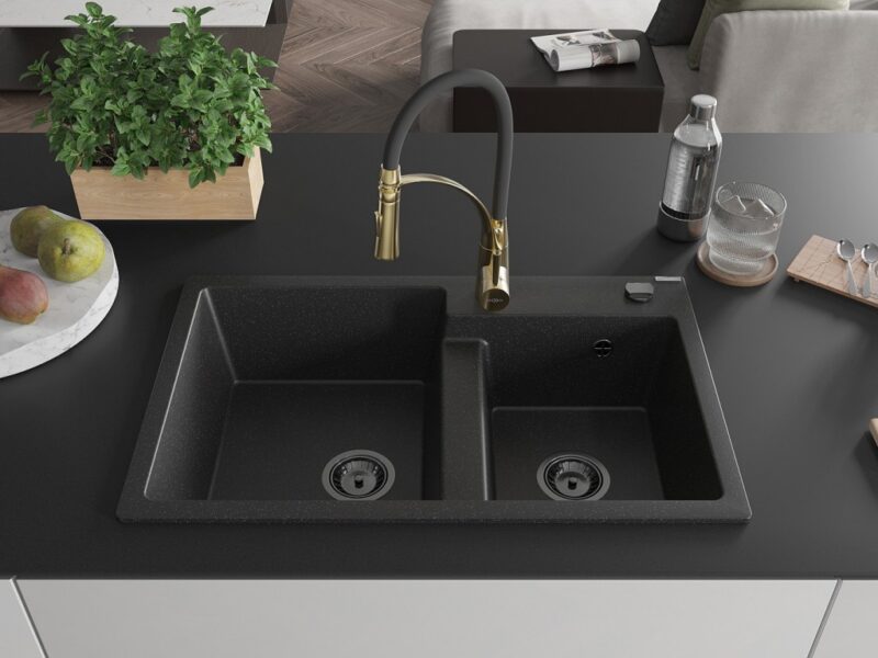 Technické dáta: Drez: Rozmer: 800x500x190 mm Hĺbka komory: 180 mm (väčšia), 180 mm (menšia) Rozmery komory: 440×387 mm (väčšie), 370×303 mm (menšie) Priemer odtoku: ø90 mm Typ: 2-komorový Typ: Zapustené do pracovnej dosky Materiál: žula Farba: čierna/strieborná metalíza Povrchová úprava sifónu: čierna Materiál: žula (80% žulové kamenivo 20% živice) Prepadový otvor: Áno Otvory: (batérie, automat) 2 Vysoká odolnosť proti poškriabaniu a zmene farby Odolnosť proti tepelným šokom Povrch pre ľahké čistenie Jeden dodatočný vyfrézovaný otvor na samodierovanie ø35 Kuchynská batéria: Materiál: mosadz Farba: Zlatá/Čierna Hlava: Keramická Perlátor: Áno Typ výtoku: Flexibilný s mosadznou podperou Typ: Jednopákové Výška batérie: 430 mm Rozsah výtoku: 235 mm(GT) Ean: 5905315048196