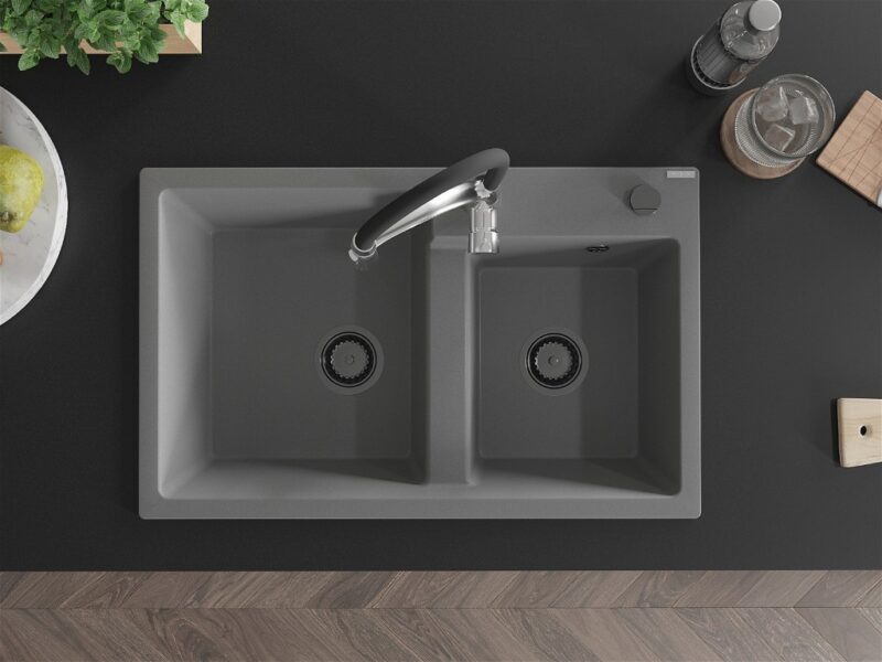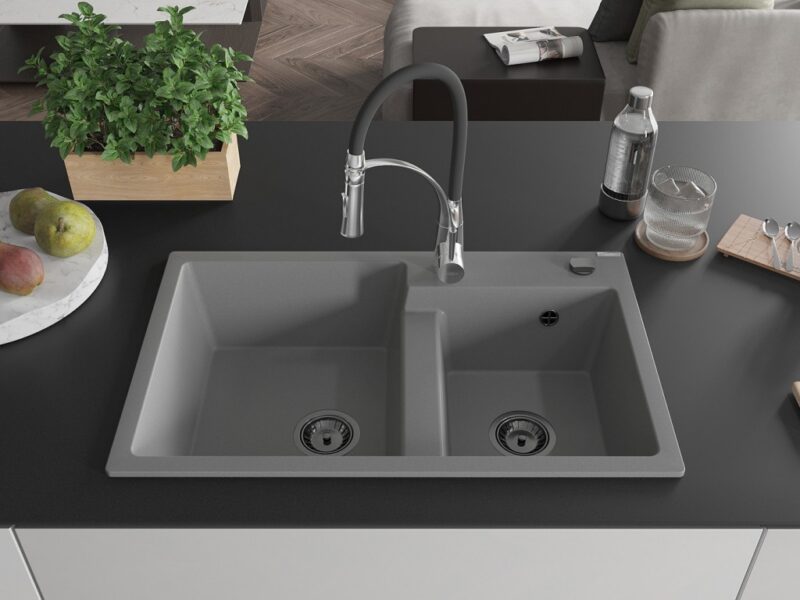 Technické dáta: Drez: Rozmer: 800x500x190 mm Hĺbka komory: 180 mm (väčšia), 180 mm (menšia) Rozmery komory: 440×387 mm (väčšie), 370×303 mm (menšie) Priemer odtoku: ø90 mm Typ: 2-komorový Typ: Zapustené do pracovnej dosky Materiál: žula Šedá farba Povrchová úprava sifónu: čierna Materiál: žula (80% žulové kamenivo 20% živice) Prepadový otvor: Áno Otvory: (batérie, automat) 2 Vysoká odolnosť proti poškriabaniu a zmene farby Odolnosť proti tepelným šokom Povrch pre ľahké čistenie Jeden dodatočný vyfrézovaný otvor na samodierovanie ø35 Kuchynská batéria: Materiál: mosadz Farba: chróm/čierna Hlava: Keramická Perlátor: Áno Typ výtoku: Flexibilný s mosadznou podperou Typ: Jednopákové Výška batérie: 430 mm Rozsah výtoku: 235 mm(GT) Ean: 5905315048110