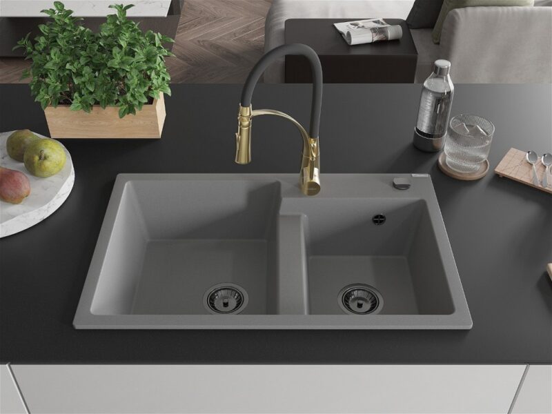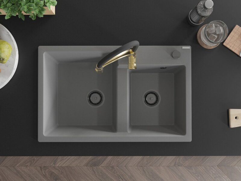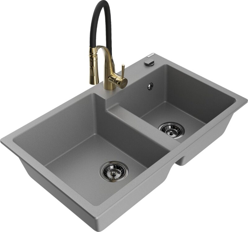 Technické dáta: drez: Rozmer: 800 x 500 x 190 mm Hĺbka komory: 180 mm (väčšia), 180 mm (menšia) Rozmery komory: 440×387 mm (väčšie), 370×303 mm (menšie) Priemer odtoku: ø90 mm Typ: 2-komorový Typ: Zapustené do pracovnej dosky Materiál: žula Šedá farba Povrchová úprava sifónu: čierna Materiál: žula (80% žulové kamenivo, 20% živice) Prepadový otvor: Áno Otvory: (batérie, automatické) 2 Vysoká odolnosť proti poškriabaniu a zmene farby Odolnosť proti tepelným šokom Ľahko čistiteľný povrch Jeden dodatočný vyfrézovaný otvor na samodierovanie ø35 kuchynská batéria: Materiál: mosadz Farba: Zlatá/Čierna Hlava: Keramická Prevzdušňovač: Áno Typ hubica: Flexibilný s mosadzným držiakom Typ: Jedna páka Výška batérie: 430 mm Rozsah výtoku: 235 mm(GT) Ean: 5905315048134