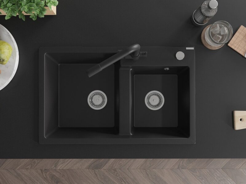 Technické dáta: drez: Rozmer: 800 x 500 x 190 mm Hĺbka komory: 180 mm (väčšia), 180 mm (menšia) Rozmery komory: 440×387 mm (väčšie), 370×303 mm (menšie) Priemer odtoku: ø90 mm Typ: 2-komorový Typ: Zapustené do pracovnej dosky Materiál: žula Čierna farba Povrchová úprava sifónu: Chrome Materiál: žula (80% žulové kamenivo, 20% živice) Prepadový otvor: Áno Otvory: (batérie, automatické) 2 Vysoká odolnosť proti poškriabaniu a zmene farby Odolnosť proti tepelným šokom Ľahko čistiteľný povrch Jeden dodatočný vyfrézovaný otvor na samodierovanie ø35 kuchynská batéria: Materiál: mosadz Čierna farba Hlava: Keramická Prevzdušňovač: Áno Typ: Dve rukoväte Rozsah výtoku: 235 mm Výška batérie: 315 mm Dvojhlavá batéria s prídavným kanálom pre filtrovanú pitnú vodu(GT) Ean: 5905315026477