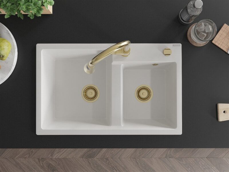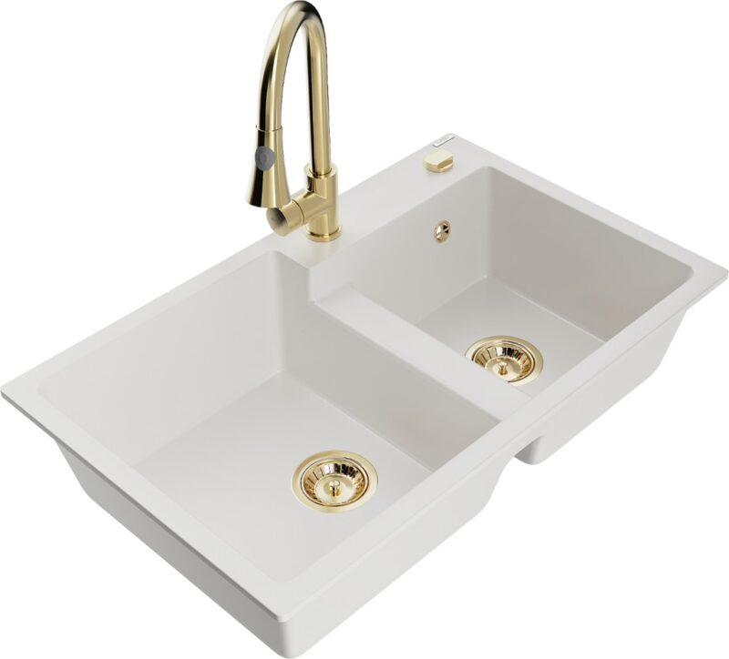 Technické dáta: drez: Rozmer: 800 x 500 x 190 mm Hĺbka komory: 180 mm (väčšia), 180 mm (menšia) Rozmery komory: 440×387 mm (väčšie), 370×303 mm (menšie) Priemer odtoku: ø90 mm Typ: 2-komorový Typ: Zapustené do pracovnej dosky Materiál: žula biela farba Povrchová úprava sifónu: zlatá Materiál: žula (80% žulové kamenivo, 20% živice) Prepadový otvor: Áno Otvory: (batérie, automatické) 2 Vysoká odolnosť proti poškriabaniu a zmene farby Odolnosť proti tepelným šokom Ľahko čistiteľný povrch Jeden dodatočný vyfrézovaný otvor na samodierovanie ø35 kuchynská batéria: Materiál: mosadz Farba: Zlatá Hlava: Keramická Prevzdušňovač: Áno Typ: Jedna páka Výška batérie: 380 mm Rozsah výtoku: 252 mm Typ výtoku: Výsuvný(GT) Ean: 5905315031310