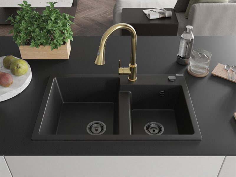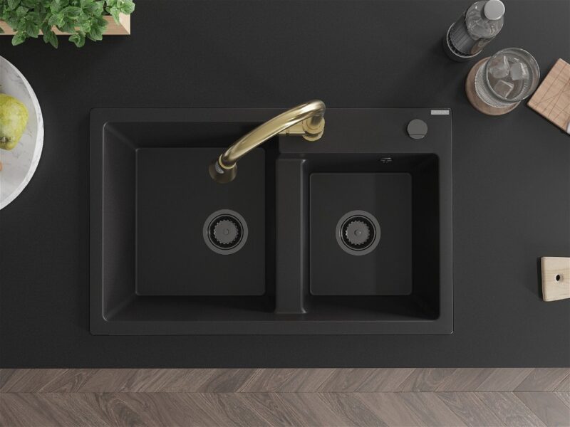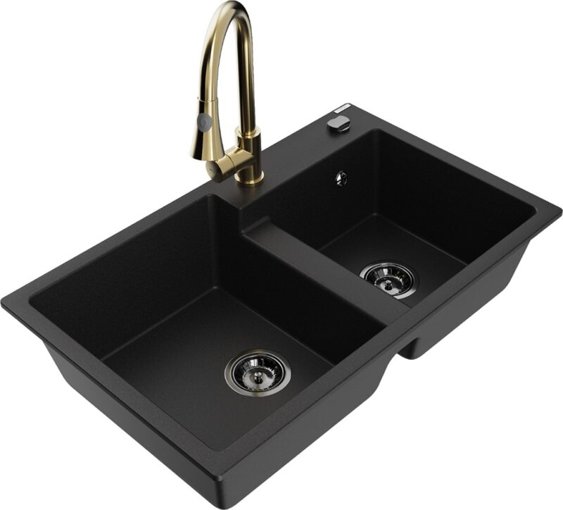 Technické dáta: drez: Rozmer: 800 x 500 x 190 mm Hĺbka komory: 180 mm (väčšia), 180 mm (menšia) Rozmery komory: 440×387 mm (väčšie), 370×303 mm (menšie) Priemer odtoku: ø90 mm Typ: 2-komorový Typ: Zapustené do pracovnej dosky Materiál: žula Čierna farba Povrchová úprava sifónu: čierna Materiál: žula (80% žulové kamenivo, 20% živice) Prepadový otvor: Áno Otvory: (batérie, automatické) 2 Vysoká odolnosť proti poškriabaniu a zmene farby Odolnosť proti tepelným šokom Ľahko čistiteľný povrch Jeden dodatočný vyfrézovaný otvor na samodierovanie ø35 kuchynská batéria: Materiál: mosadz Farba: Zlatá Hlava: Keramická Prevzdušňovač: Áno Typ: Jedna páka Výška batérie: 380 mm Rozsah výtoku: 252 mm Typ výtoku: Výsuvný(GT) Ean: 5905315031587