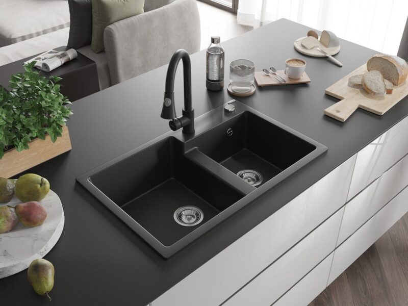 Technické dáta: drez: Rozmer: 800 x 500 x 190 mm Hĺbka komory: 180 mm (väčšia), 180 mm (menšia) Rozmery komory: 440×387 mm (väčšie), 370×303 mm (menšie) Priemer odtoku: ø90 mm Typ: 2-komorový Typ: Zapustené do pracovnej dosky Materiál: žula Čierna farba Povrchová úprava sifónu: Chrome Materiál: žula (80% žulové kamenivo, 20% živice) Prepadový otvor: Áno Otvory: (batérie, automatické) 2 Vysoká odolnosť proti poškriabaniu a zmene farby Odolnosť proti tepelným šokom Ľahko čistiteľný povrch Jeden dodatočný vyfrézovaný otvor na samodierovanie ø35 kuchynská batéria: Materiál: mosadz Čierna farba Hlava: Keramická Prevzdušňovač: Áno Typ: Jedna páka Výška batérie: 380 mm Rozsah výtoku: 252 mm Typ výtoku: Výsuvný(GT) Ean: 5905315031594