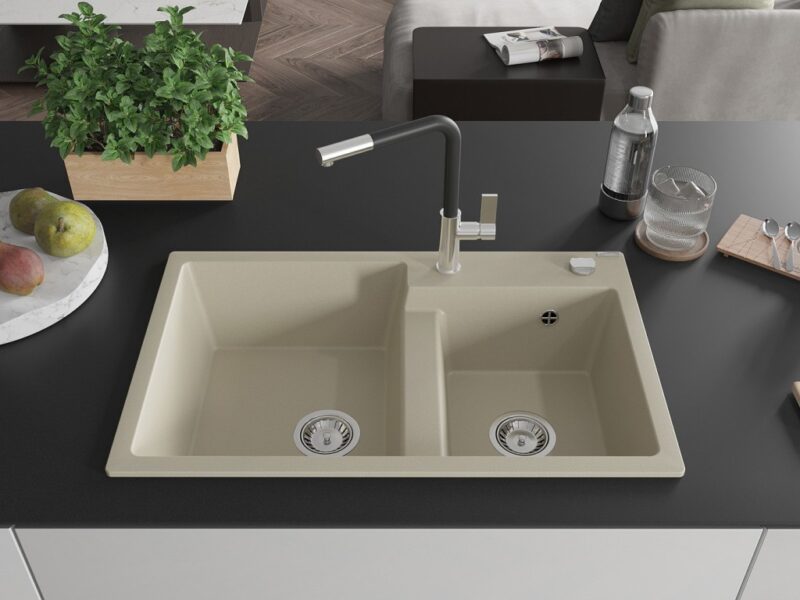 Technické dáta: drez: Rozmer: 800 x 500 x 190 mm Hĺbka komory: 180 mm (väčšia), 180 mm (menšia) Rozmery komory: 440×387 mm (väčšie), 370×303 mm (menšie) Priemer odtoku: ø90 mm Typ: 2-komorový Typ: Zapustené do pracovnej dosky Materiál: žula Farba béžová Povrchová úprava sifónu: Chrome Materiál: žula (80% žulové kamenivo, 20% živice) Prepadový otvor: Áno Otvory: (batérie, automatické) 2 Vysoká odolnosť proti poškriabaniu a zmene farby Odolnosť proti tepelným šokom Ľahko čistiteľný povrch Jeden dodatočný vyfrézovaný otvor na samodierovanie ø35 kuchynská batéria: Materiál: mosadz Farba: chróm/čierna Hlava: Keramická Prevzdušňovač: Áno Typ: Jedna páka Rozsah výtoku: 245 mm Výška batérie: 307 mm(GT) Ean: 5905315062543