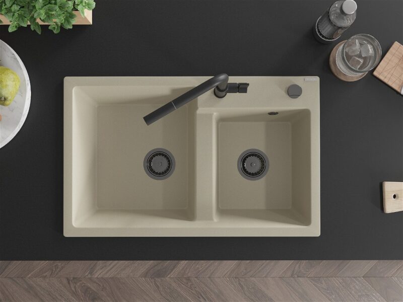 Technické dáta: drez: Rozmer: 800 x 500 x 190 mm Hĺbka komory: 180 mm (väčšia), 180 mm (menšia) Rozmery komory: 440×387 mm (väčšie), 370×303 mm (menšie) Priemer odtoku: ø90 mm Typ: 2-komorový Typ: Zapustené do pracovnej dosky Materiál: žula Farba béžová Povrchová úprava sifónu: čierna Materiál: žula (80% žulové kamenivo, 20% živice) Prepadový otvor: Áno Otvory: (batérie, automatické) 2 Vysoká odolnosť proti poškriabaniu a zmene farby Odolnosť proti tepelným šokom Ľahko čistiteľný povrch Jeden dodatočný vyfrézovaný otvor na samodierovanie ø35 kuchynská batéria: Materiál: mosadz Čierna farba Hlava: Keramická Prevzdušňovač: Áno Typ: Jedna páka Rozsah výtoku: 245 mm Výška batérie: 307 mm(GT) Ean: 5905315062598