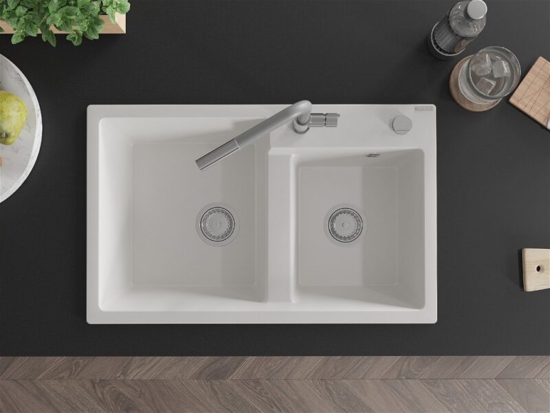 MEXEN/S MEXEN/S – Tomas granitový drez 2-bowl vrátane batérie Flora, biela 6516-20-670401-06