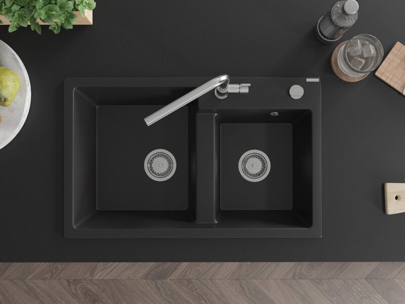 MEXEN/S MEXEN/S – Tomas granitový drez 2-bowl vrátane batérie Flora, čierna 6516-77-670401-00