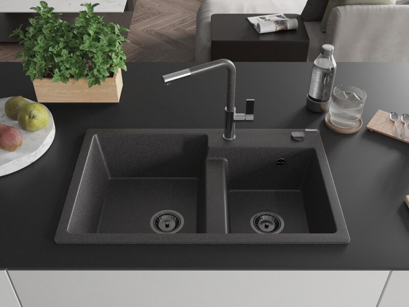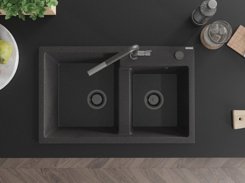 Technické dáta: Drez: Rozmer: 800x500x190 mm Hĺbka komory: 180 mm (väčšia), 180 mm (menšia) Rozmery komory: 440×387 mm (väčšie), 370×303 mm (menšie) Priemer odtoku: ø90 mm Typ: 2-komorový Typ: Zapustené do pracovnej dosky Materiál: žula Farba: Škvrnitá čierna Povrchová úprava sifónu: čierna Materiál: žula (80% žulové kamenivo 20% živice) Prepadový otvor: Áno Otvory: (batérie, automat) 2 Vysoká odolnosť proti poškriabaniu a zmene farby Odolnosť proti tepelným šokom Povrch pre ľahké čistenie Jeden dodatočný vyfrézovaný otvor na samodierovanie ø35 Kuchynská batéria: Materiál: mosadz Farba: chróm/čierna škvrnitá Hlava: Keramická Perlátor: Áno Typ: Jednopákové Rozsah výtoku: 245 mm Výška batérie: 307 mm(GT) Ean: 5905315062833