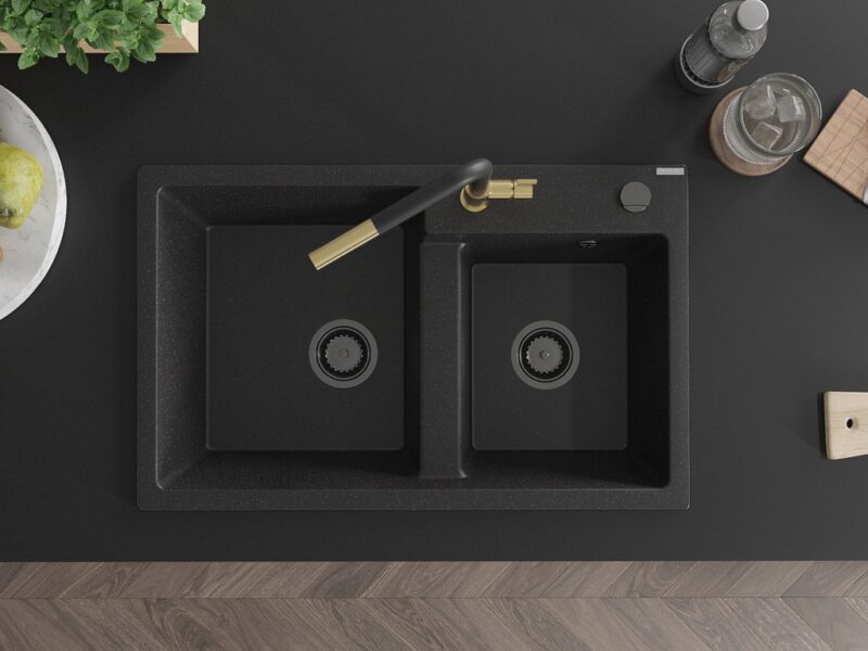 Technické dáta: Drez: Rozmer: 800x500x190 mm Hĺbka komory: 180 mm (väčšia), 180 mm (menšia) Rozmery komory: 440×387 mm (väčšie), 370×303 mm (menšie) Priemer odtoku: ø90 mm Typ: 2-komorový Typ: Zapustené do pracovnej dosky Materiál: žula Farba: čierna/strieborná metalíza Povrchová úprava sifónu: čierna Materiál: žula (80% žulové kamenivo 20% živice) Prepadový otvor: Áno Otvory: (batérie, automat) 2 Vysoká odolnosť proti poškriabaniu a zmene farby Odolnosť proti tepelným šokom Povrch pre ľahké čistenie Jeden dodatočný vyfrézovaný otvor na samodierovanie ø35 Kuchynská batéria: Materiál: mosadz Farba: Zlatá/Čierna Hlava: Keramická Perlátor: Áno Typ: Jednopákové Rozsah výtoku: 245 mm Výška batérie: 307 mm(GT) Ean: 5905315062710