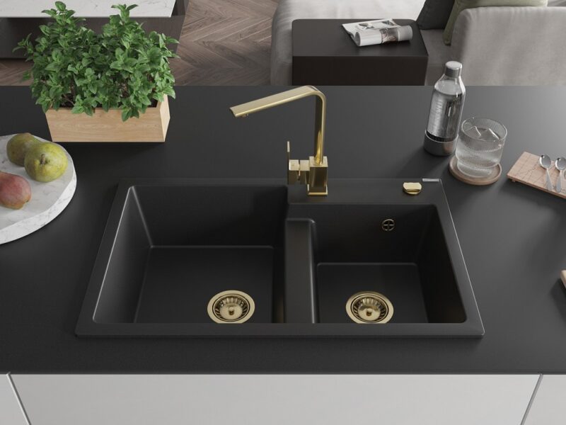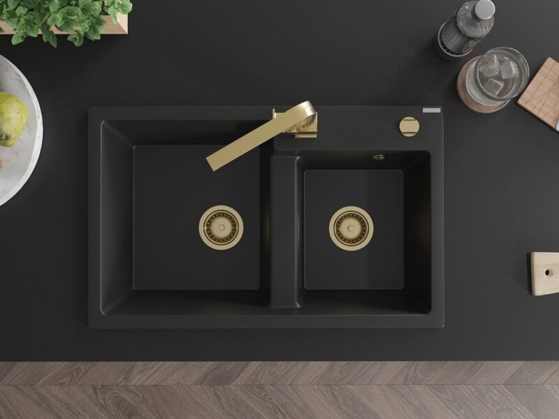 Technické dáta: drez: Rozmer: 800 x 500 x 190 mm Hĺbka komory: 180 mm (väčšia), 180 mm (menšia) Rozmery komory: 440×387 mm (väčšie), 370×303 mm (menšie) Priemer odtoku: ø90 mm Typ: 2-komorový Typ: Zapustené do pracovnej dosky Materiál: žula Čierna farba Povrchová úprava sifónu: zlatá Materiál: žula (80% žulové kamenivo, 20% živice) Prepadový otvor: Áno Otvory: (batérie, automatické) 2 Vysoká odolnosť proti poškriabaniu a zmene farby Odolnosť proti tepelným šokom Ľahko čistiteľný povrch Jeden dodatočný vyfrézovaný otvor na samodierovanie ø35 kuchynská batéria: Materiál: mosadz Farba: Zlatá Hlava: Keramická Prevzdušňovač: Áno Typ: Jedna páka Výška batérie: 290 mm Rozsah výtoku: 220 mm(GT) Ean: 5905315021335