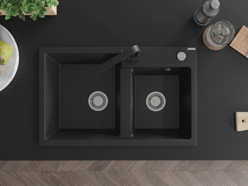 Technické dáta: drez: Rozmer: 800 x 500 x 190 mm Hĺbka komory: 180 mm (väčšia), 180 mm (menšia) Rozmery komory: 440×387 mm (väčšie), 370×303 mm (menšie) Priemer odtoku: ø90 mm Typ: 2-komorový Typ: Zapustené do pracovnej dosky Materiál: žula Čierna farba Povrchová úprava sifónu: Chrome Materiál: žula (80% žulové kamenivo, 20% živice) Prepadový otvor: Áno Otvory: (batérie, automatické) 2 Vysoká odolnosť proti poškriabaniu a zmene farby Odolnosť proti tepelným šokom Ľahko čistiteľný povrch Jeden dodatočný vyfrézovaný otvor na samodierovanie ø35 kuchynská batéria: Materiál: mosadz Čierna farba Hlava: Keramická Prevzdušňovač: Áno Typ: Jedna páka Výška batérie: 290 mm Rozsah výtoku: 220 mm(GT) Ean: 5905315021359