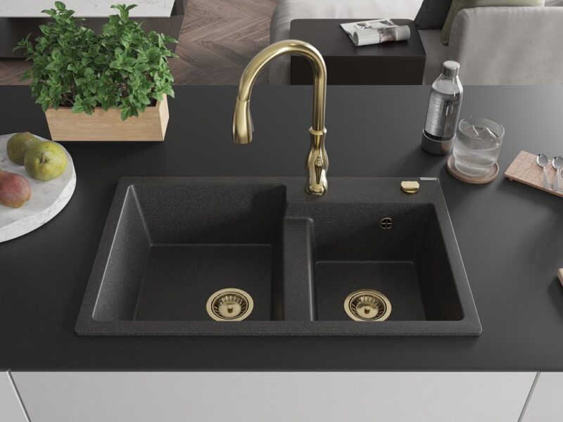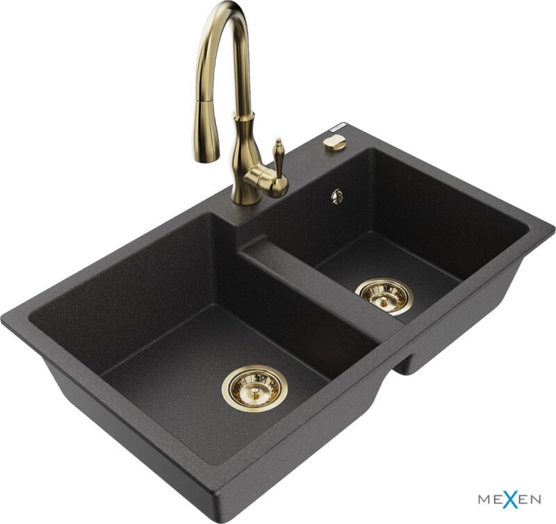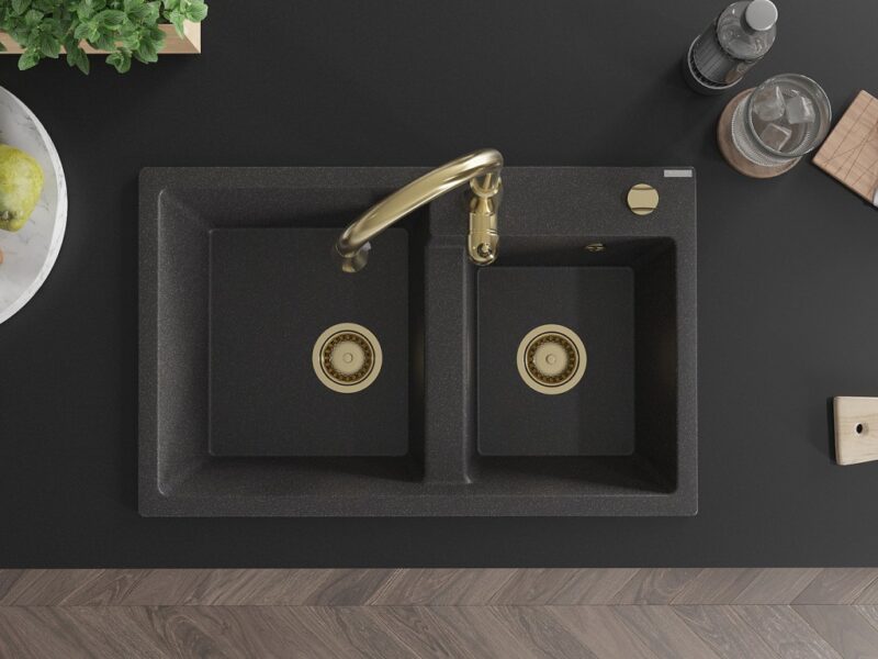 Technické dáta: drez: Rozmer: 800 x 500 x 190 mm Hĺbka komory: 180 mm (väčšia), 180 mm (menšia) Rozmery komory: 440×387 mm (väčšie), 370×303 mm (menšie) Priemer odtoku: ø90 mm Typ: 2-komorový Typ: Zapustené do pracovnej dosky Farba: Škvrnitá čierna Povrchová úprava sifónu: zlatá Materiál: žula (80% žulové kamenivo, 20% živice) Prepadový otvor: Áno Otvory: (batérie, automatické) 2 Vysoká odolnosť proti poškriabaniu a zmene farby Odolnosť proti tepelným šokom Ľahko čistiteľný povrch Jeden dodatočný vyfrézovaný otvor na samodierovanie ø35 kuchynská batéria: Materiál: mosadz Farba: Zlatá Hlava: Keramická Prevzdušňovač: Áno Typ: Jedna páka Výška batérie: 410 mm Rozsah výtoku: 231 mm(GT) Ean: 5905315036636