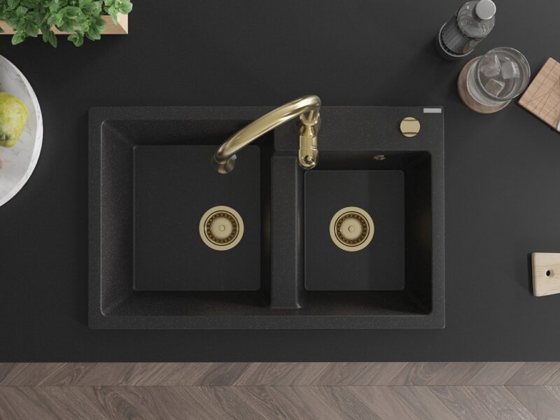 Technické dáta: drez: Rozmer: 800 x 500 x 190 mm Hĺbka komory: 180 mm (väčšia), 180 mm (menšia) Rozmery komory: 440×387 mm (väčšie), 370×303 mm (menšie) Priemer odtoku: ø90 mm Typ: 2-komorový Typ: Zapustené do pracovnej dosky Farba: čierna/strieborná metalíza Povrchová úprava sifónu: zlatá Materiál: žula (80% žulové kamenivo, 20% živice) Prepadový otvor: Áno Otvory: (batérie, automatické) 2 Vysoká odolnosť proti poškriabaniu a zmene farby Odolnosť proti tepelným šokom Ľahko čistiteľný povrch Jeden dodatočný vyfrézovaný otvor na samodierovanie ø35 kuchynská batéria: Materiál: mosadz Farba: Zlatá Hlava: Keramická Prevzdušňovač: Áno Typ: Jedna páka Výška batérie: 410 mm Rozsah výtoku: 231 mm(GT) Ean: 5905315036544