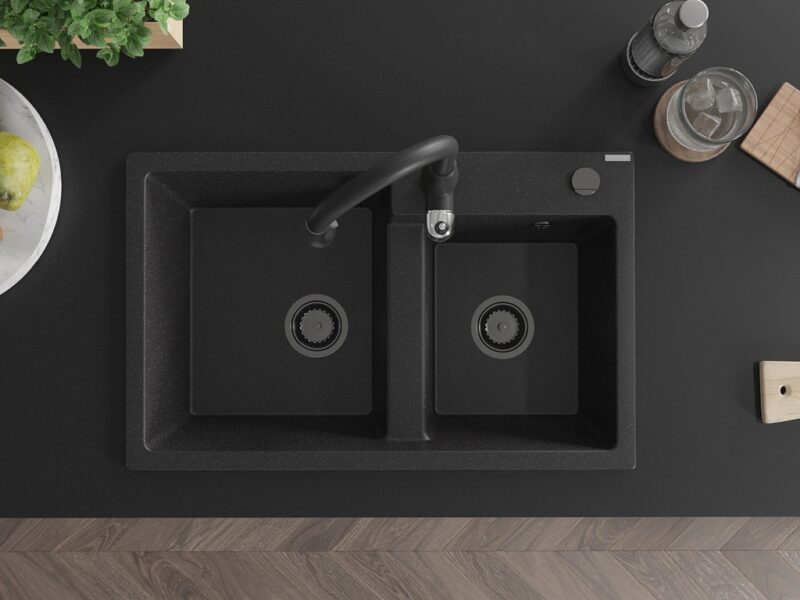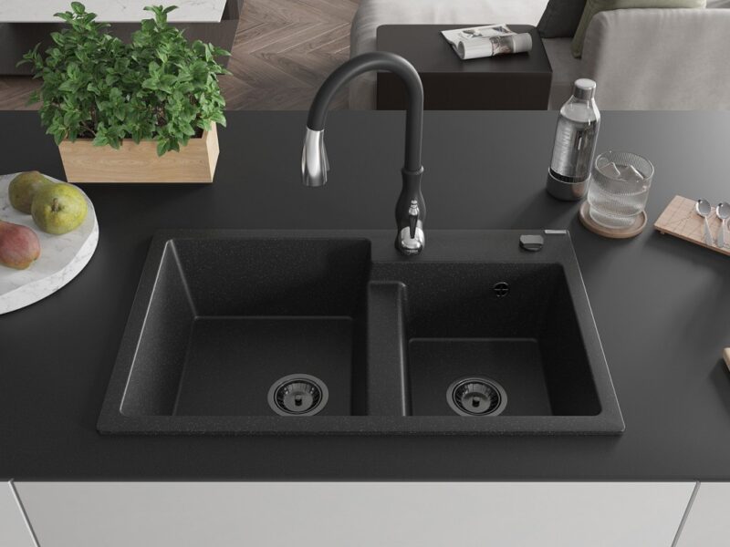 Technické dáta: drez: Rozmer: 800 x 500 x 190 mm Hĺbka komory: 180 mm (väčšia), 180 mm (menšia) Rozmery komory: 440×387 mm (väčšie), 370×303 mm (menšie) Priemer odtoku: ø90 mm Typ: 2-komorový Typ: Zapustené do pracovnej dosky Farba: čierna/strieborná metalíza Povrchová úprava sifónu: čierna Materiál: žula (80% žulové kamenivo, 20% živice) Prepadový otvor: Áno Otvory: (batérie, automatické) 2 Vysoká odolnosť proti poškriabaniu a zmene farby Odolnosť proti tepelným šokom Ľahko čistiteľný povrch Jeden dodatočný vyfrézovaný otvor na samodierovanie ø35 kuchynská batéria: Materiál: mosadz Čierna farba Hlava: Keramická Prevzdušňovač: Áno Typ: Jedna páka Výška batérie: 410 mm Rozsah výtoku: 231 mm(GT) Ean: 5905315036568