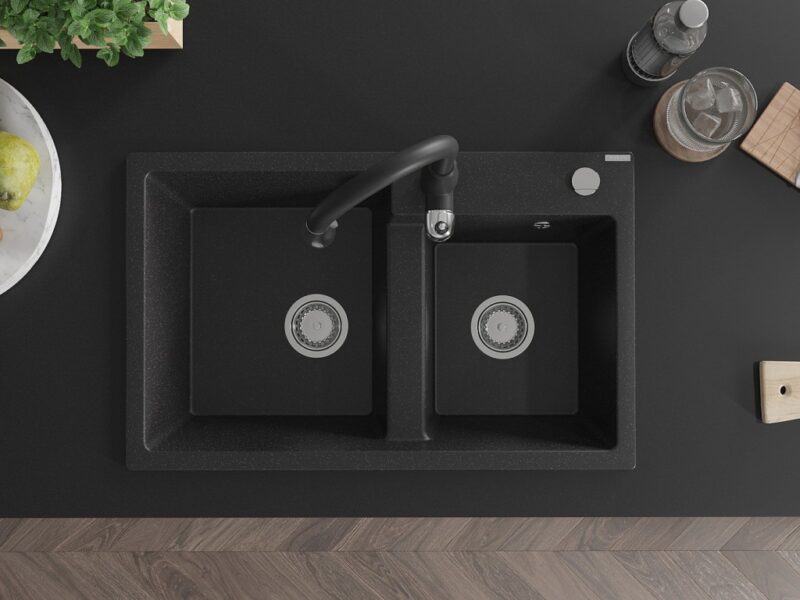 Technické dáta: drez: Rozmer: 800 x 500 x 190 mm Hĺbka komory: 180 mm (väčšia), 180 mm (menšia) Rozmery komory: 440×387 mm (väčšie), 370×303 mm (menšie) Priemer odtoku: ø90 mm Typ: 2-komorový Typ: Zapustené do pracovnej dosky Farba: čierna/strieborná metalíza Povrchová úprava sifónu: Chrome Materiál: žula (80% žulové kamenivo, 20% živice) Prepadový otvor: Áno Otvory: (batérie, automatické) 2 Vysoká odolnosť proti poškriabaniu a zmene farby Odolnosť proti tepelným šokom Ľahko čistiteľný povrch Jeden dodatočný vyfrézovaný otvor na samodierovanie ø35 kuchynská batéria: Materiál: mosadz Čierna farba Hlava: Keramická Prevzdušňovač: Áno Typ: Jedna páka Výška batérie: 410 mm Rozsah výtoku: 231 mm(GT) Ean: 5905315036551