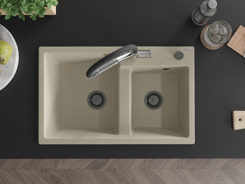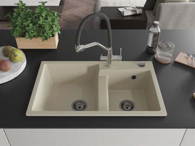 Technické dáta: drez: Rozmer: 800 x 500 x 190 mm Hĺbka komory: 180 mm (väčšia), 180 mm (menšia) Rozmery komory: 440×387 mm (väčšie), 370×303 mm (menšie) Priemer odtoku: ø90 mm Typ: 2-komorový Typ: Zapustené do pracovnej dosky Materiál: žula Farba béžová Povrchová úprava sifónu: čierna Materiál: žula (80% žulové kamenivo, 20% živice) Prepadový otvor: Áno Otvory: (batérie, automatické) 2 Vysoká odolnosť proti poškriabaniu a zmene farby Odolnosť proti tepelným šokom Ľahko čistiteľný povrch Jeden dodatočný vyfrézovaný otvor na samodierovanie ø35 kuchynská batéria: Materiál: mosadz Farba: chróm/čierna Hlavy: Keramické Prevzdušňovač: Áno Typ hubica: Flexibilný s mosadzným držiakom Rozsah výtoku: 260 mm Výška: 405 mm Typ: Dve rukoväte Dvojhlavá batéria s prídavným filtrom na pitnú vodu(GT) Ean: 5905315054777